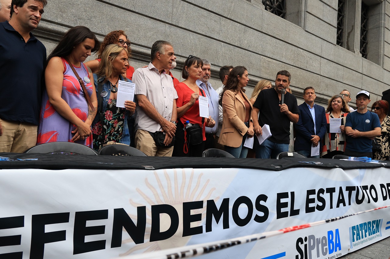 La protesta, que consistió en la presentación oficial de la solicitada firmada por más de 3000 periodistas contra la derogación del Estatuto, se realizó frente al Congreso de la Nación, en Hipólito Yrigoyen y Entre Ríos, en el marco de una conferencia de prensa convocada por el SiPreBA y la FATPREN.
