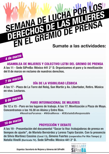 El Sindicato de Prensa de Buenos Aires te invita a sumarte a las iniciativas promovidas por la Secretaría de Mujeres y Géneros: Asamblea de Mujeres y Colectivo LGBTI del Gremio (4 de marzo); Día de la visibilidad lésbica (7 de marzo); Paro Internacional de Mujeres (8 de marzo); y Presentación del documental “Sacar la Voz: Trabajadoras de Prensa en tiempos de ajuste” (10 de marzo).